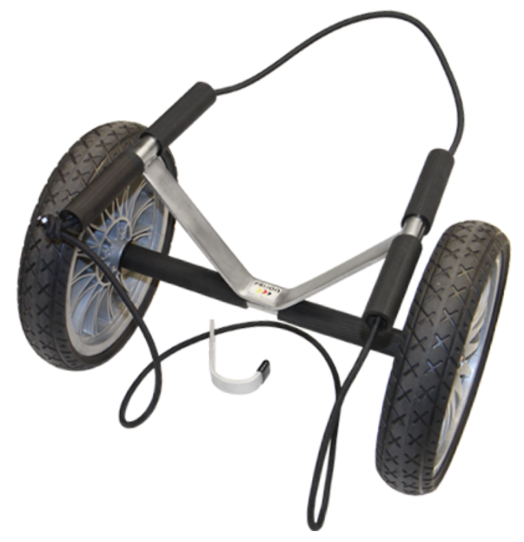 It consist of alltogether 3 parts - a one-piece body and two wheels - which makes assembling and disassembling very easy. The wheels can easily be dismounted by a push-button. By shortening the rubber bands you can adopt the cart individually to your kayak.
